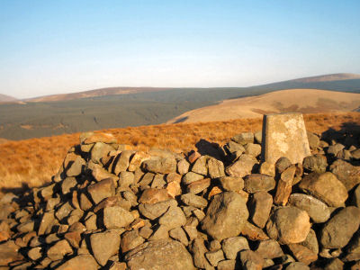 The trig point surrounded by a cairn on the summit of Shillhope Law |